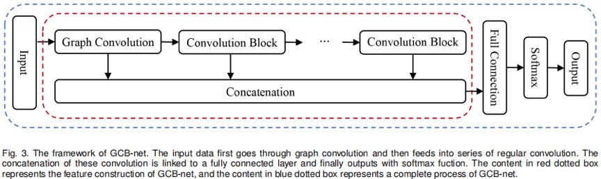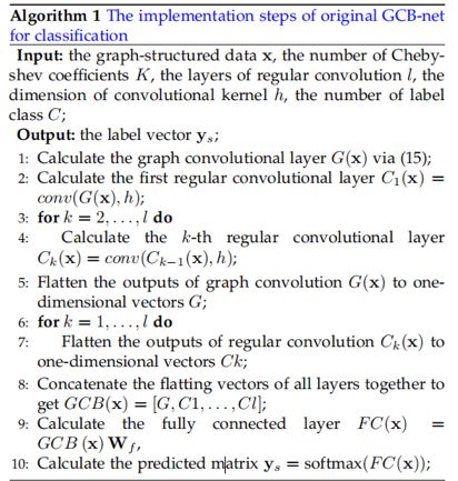 如图 3 所示,该网络首先利用切比雪夫图卷积来处理不规则网格数据。然后利用正则卷积提取更高层次的特征。在所有的卷积之后,不同层的输出被平铺成一维向量并连接在一起。然后,对网络进行全连通层预测,并利用 softmax 函数进行预测。Original GCB-net 伪代码如图 4 所示。