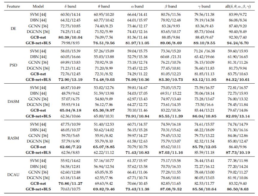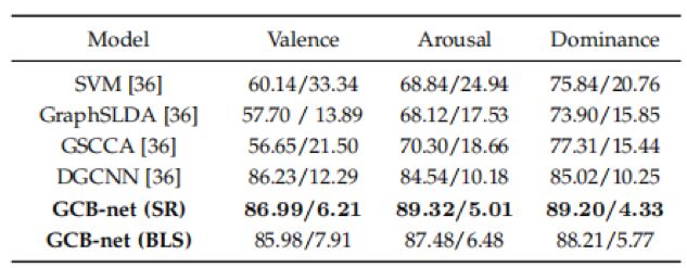 GCB-net with BLS 取得了最好的效果,验证了模型的有效性。DREAMER 数据集实验结果如图 8 所示,可以观察到,大部分方法在 Dominance 维度识别效果较好,虽然 GCB-net+BLS 的性能相对于 GCB-net 并没有得到提升,但其准确性仍优于或接近 DGCNN 的结果,说明了 GCB 模型的有效性。