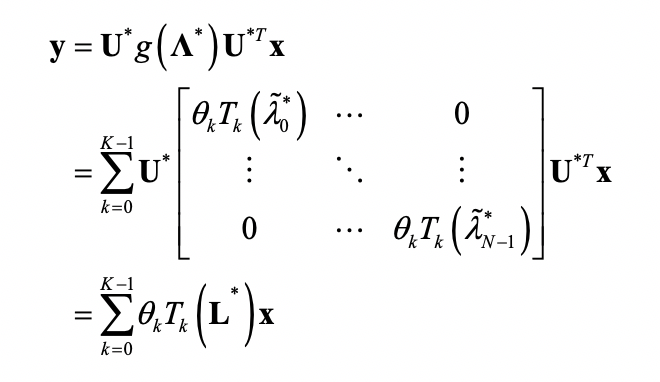 上式表示计算 x 的图卷积可以表示为 x 与切比雪夫多项式各分量卷积结果的组合。