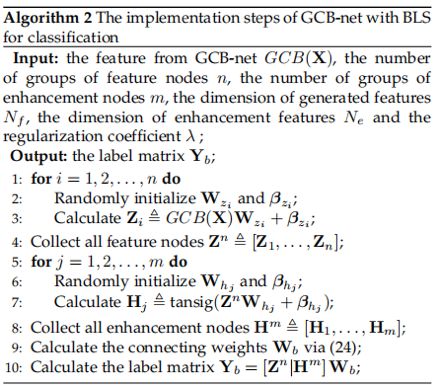 为了提高 GCB-net 的性能,可以使用 BLS 来增强 GCB-net 的特征。首先通过特征映射和增强映射将 GCB 特征扩展到随机的广义空间,然后通过特征节点和增强节点的连接对输出进行预测。GCB-net with BLS 伪代码与示意图如图 5 和图 6 所示。