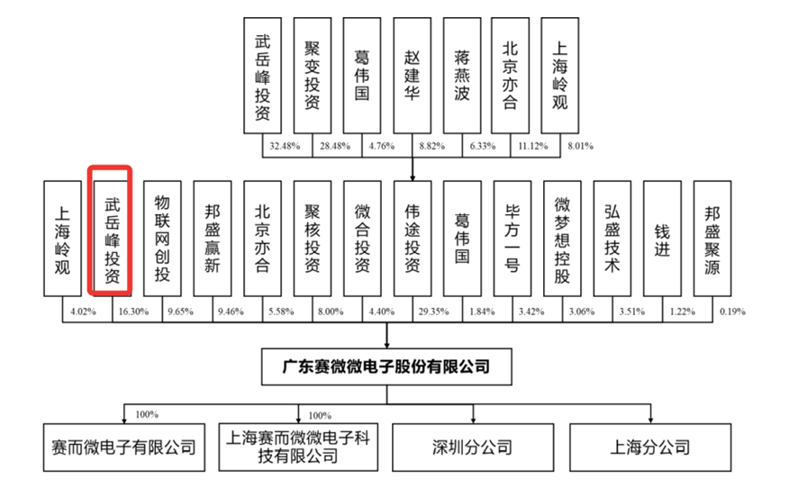 翻开公司股权结构可见,赛微微电的第一大股东为伟途投资,持股29.35%。而伟途投资最大单一股东为武岳峰投资,其次为聚变投资(员工持股平台)。