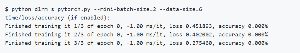 python dlrm_s_pytorch.py --arch-sparse-feature-size=16 --arch-mlp-bot="13-512-256-64-16" --arch-mlp-top="512-256-1" --data-generation=dataset --data-set=kaggle --processed-data-file=./input/kaggle_processed.npz --loss-function=bce --round-targets=True --learning-rate=0.1 --mini-batch-size=128 --print-freq=1024 --print-time