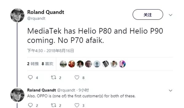 8月17日消息,知名爆料人士Roland Quandt透露,联发科即将推出新一代P系列芯片Helio P80和Helio P90,传闻中的Helio P70并不存在。从命名看出,Helio P80、Helio P90是Helio P60的升级版本,遗憾的是Roland Quandt并没有透露详细规格。值得一提的是,Roland Quandt透露,OPPO将是联发科Helio P80、Helio P90的首批客户之一。由此看出,上述芯片可能会被应用在OPPO中端手机上。