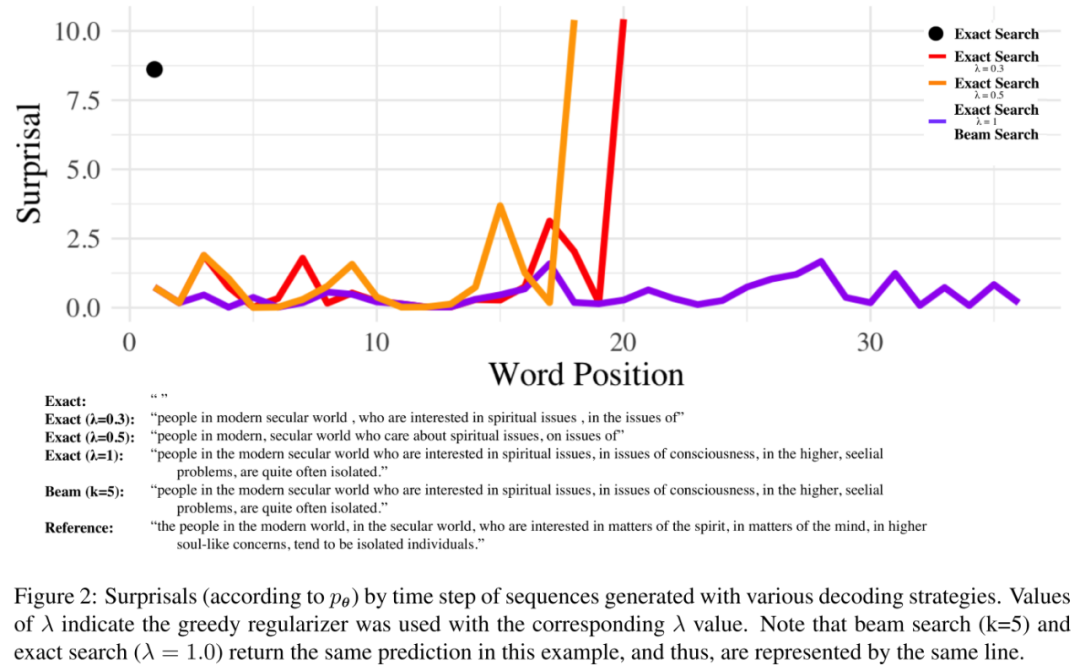 beam search在每一步给出似然概率最大的大小为 的候选集,从信息论的角度来看,就是保证每一步生成的单词所带来的信息量最小,因此这样搜索到的句子的信息量就倾向于均匀分布在每一个单词中,而exact search给出的全局最优解可能会为了追求整体的似然概率最大而给出信息分布不均衡的序列。