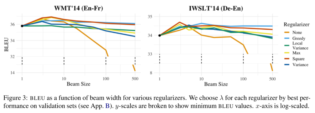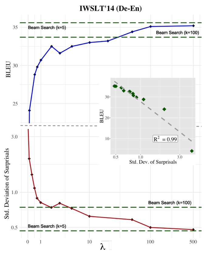 作者在机器翻译任务(IWSLT'14 De-En, WMT'14 En-Fr)上验证UID正则化的有效性,由于只是对解码过程做实验,不需要自己建立模型,所以作者直接调用了fairseq中基于Transformer的翻译模型,作者在不同的正则化强度 下,在测试集上使用Dijkstra算法求得上述加上UID正则项的优化目标的全局最优解,然后使用SacreBLEU评分系统为生成的翻译打分。