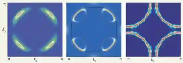 断断续续费米弧。由于赝能隙的存在,在欠掺杂的某些区域,铜氧化物高温超导材料的费米面居然是不连续的!而是被打断的片状“费米弧”,在费米弧的不同位置,超导能隙或赝能隙的大小还会发生变化。费米弧的长短似乎和超导临界温度有一定的关系,但也不是很明确。这无论如何都是很难理解的,因为在传统的金属中(注:高温超导体掺杂后已经具有金属性),费米面都是连续的,甚至是完全闭合的球形,从来不会有如此“支零破碎”的费米面。看热闹不嫌事大,在人们为不连续的费米面困惑不已的时候,在高质量单晶样品上的更多实验证据说明体系还存在小的“费米口袋”,即费米面实际上由四个小袋袋组成。因为某些测量手段对内侧的“口袋壁”不敏感,所以造成了只测到半边口袋,看起来像是个弧。还有说法是“费米口袋”和“费米弧”两者是独立存在的,在外侧边比较靠近而已,真是越搞越糊涂。只有当进入过掺杂区后,体系空穴浓度大大增加,费米面才恢复到常见的连续费米面(图5)(注:图示是空穴型高温超导材料,所以费米面的曲率是朝外弯曲的)。费米面的不清不楚,很大程度也是因为在欠掺杂区存在 多 种 竞 争 电 子序,这些有序电子态同样会造成费米面的折叠或变形。而铜氧化物材料在结构上的不均匀性或者调制,也会造成费米面的变化。整体来说,我们仍然不明白为何费米面会如此古灵精怪。