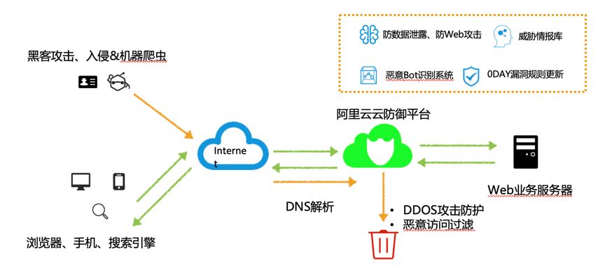 对单一源IP的访问频率进行控制、重定向跳转验证、人机识别等。针对海量慢速请求攻击、根据统计响应码及URL请求分布、异常Referer及User-Agent特征识别,结合网站精准防护规则进行综合防护。充分利用阿里云大数据安全优势、建立威胁情报与可信访问分析模型、快速识别恶意流量。