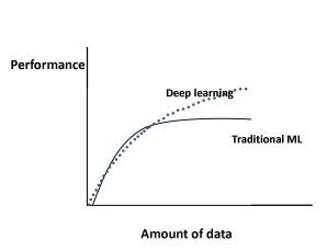 上图展示了在传统机器学习 [10] 算法(回归等)和深度学习 [11] 的情况下,机器学习算法的性能随着数据量的增加而如何变化。