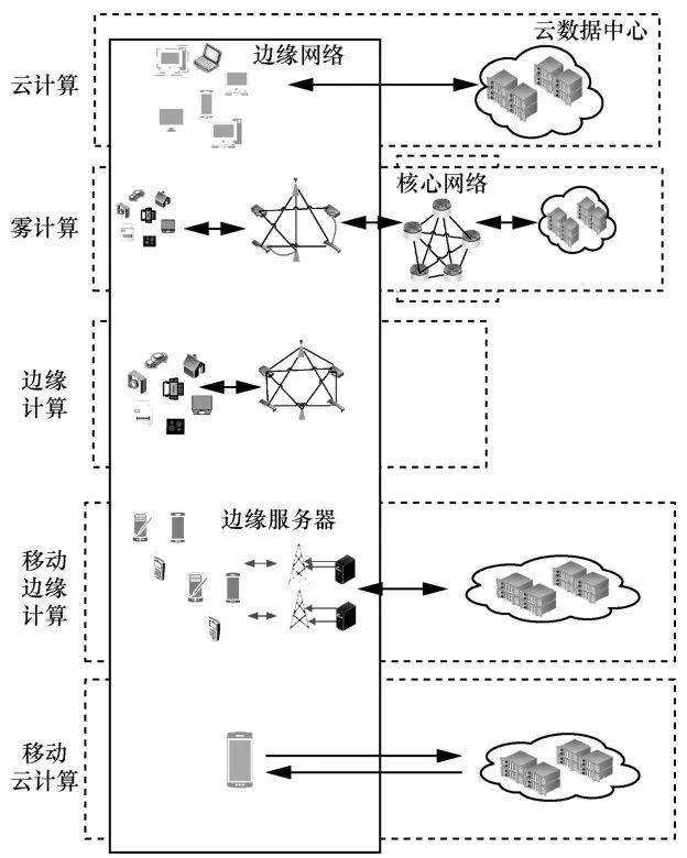 像MEC和MCC一样,雾计算也可以启用边缘计算。但是,除边缘网络之外,雾计算可以扩展到核心网络[29],更确切地说,边缘和核心网络(如核心路由器、区域服务器和万兆交换机等)组件可以用作计算的基础设施。通过雾计算、信号序列和多级应用程序部署和服务请求。另外,边缘网络上的雾计算组件可以放置在距离物联网设备/传感器比较近的地方。由于物联网设备/传感器密集分布,需要对服务请求进行实时响应,因此这种方法可以使物联网数据在物联网设备/传感器附近进行存储和处理。实时物联网应用的服务交付时延将在很大程度上降至最低,与边缘计算不同,雾计算可以将基础设施即服务(IaaS)、平台即服务(PaaS)和软件即服务(SaaS)等基于云的服务扩展到网络边缘。具体的不同计算范式的计算领域区别如图2所示。