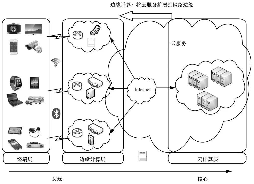 边缘计算层位于网络的边缘,由大量的边缘节点组成,这些边缘节点包括网络设备(如路由器、网关、接入点、基站等)和特定的边缘服务器等(愿意贡献资源的移动设备,包括手机、车辆等)。这些边缘节点广泛分布在终端设备和云端之间,如咖啡馆、购物中心、公交总站、街道、公园等。边缘节点可以被部署在网络连接中的任何地方,如智能电话中、工厂地板上、路边单元中、车辆中或电线杆顶部。它们能够对收到的感知数据进行计算、传输和临时存储。由于这些边缘节点距离设备仅有一个或两个跳数,因此,实时分析和对时延较为敏感的应用可以在边缘计算层执行。此外,边缘节点也可通过IP核心网络与云数据中心连接,并负责与云交互、合作以获得更强大的计算和存储功能。该层旨在将云计算扩展到网络边缘,它具有一定的计算和存储能力。边缘计算层负责定期向云层发送数据,能够提供数据缓存、本地化计算和无线接入三大主要功能,满足移动设备的低时延和高流量需求。