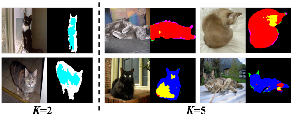 可以看出像素级别特征受到像素在所属物体中的位置、所属物体的姿势、所属物体的背景环境等因素影响。比如左图K=2的情况,猫轮廓的像素级别特征被聚成一类,猫内部的像素级别特征被聚成一类。右图K=5的情况,红色像素受到背景中床单的影响,蓝色像素受到背景中绿色植被的影响。
