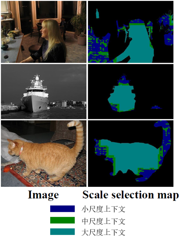 下图是基于Pascal-VOC数据集的上下文选择器的可视化效果。上下文选择器可以推断出影响每个像素级别特征的上下文范围大小(小尺度、中尺度或大尺度)。