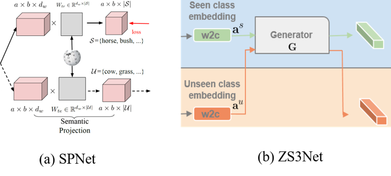 现有的零样本语义分割方法有SPNet[1]和ZS3Net[2 ], 如下图所示。SPNet根据已知种类数据学习从像素级别特征到词向量的映射,在测试阶段可以通过比较映射后的像素级别特征和所有种类的词向量完成分割。