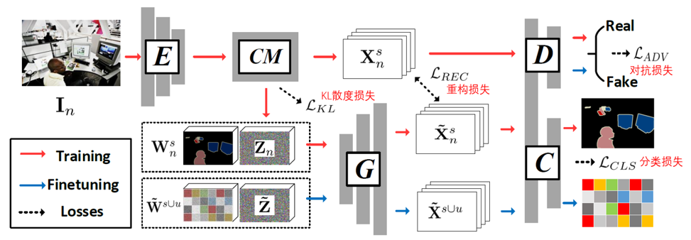 另外,作者用鉴别器D和分类器C保证生成的特征分布接近真实的特征分布,并且属于预期的种类。先用已知种类的像素训练网络,因为上下文潜在编码被强制接近单位高斯分布,给定一个未知种类的词向量,可以从单位高斯分布生成随机向量,和未知种类的词向量共同输入到特征生成器G,得到该未知种类的像素级别特征。