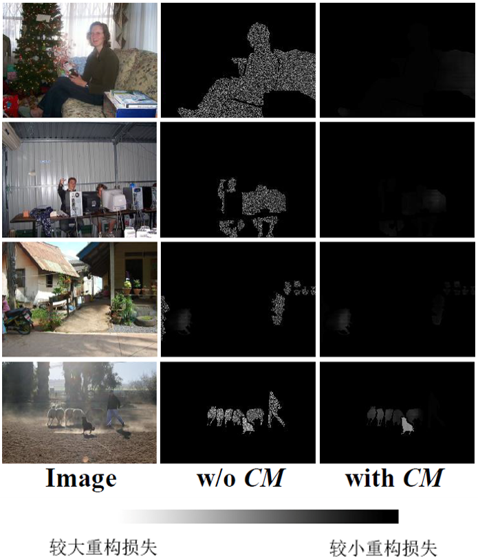 下图是基于Pascal-VOC数据集测试集图片的特征重构损失的可视化结果。通过对比w/o CM和with CM, 可以看出加入CM模块之后本文的方法能准确重构出可见类甚至不可见类的像素级别特征,比如沙发(第一行)、显示器(第二行)、盆栽植物(第三行)、绵羊(第四行)。