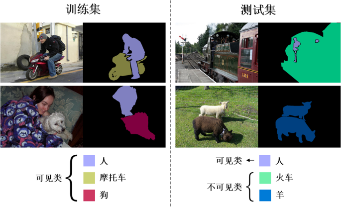 下图是零样本语义分割任务的图示。和零样本分类相同,零样本语义分割把所有种类分为已知种类和未知种类两个集合,两个集合没有交集。训练集只有已知种类的分割掩码,测试集包含已知种类和未知种类。零样本语义分割旨在通过种类级别的语义表征(比如词向量、属性向量等)从已知种类向未知种类迁移信息,从而在测试阶段完成已知种类和未知种类的分割。
