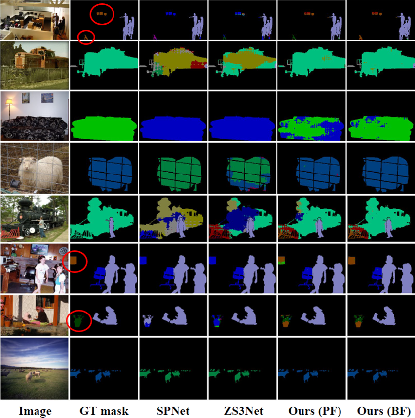 下面的表格总结了在三个数据库上本文的方法和现有方法SPNet、ZS3Net的实验结果。其中ST表示自学习策略 (self-training),即用训练集中未标注的未知种类像素辅助训练。从表格中可以看到本文的方法在不可见类指标和综合指标上均取得了大幅提升。对于hIoU指标,Ours(BF)相较于基准方法在三个数据集上分别带来了67.7%、30.4%和 50.5% 的相对提升。