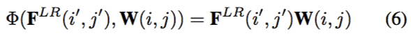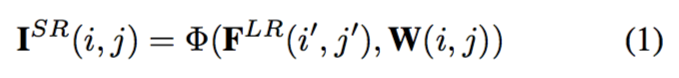 FeatureMapping。Location Projection 和 Weight Prediction 之后要做的就是把特征映射到 SR 图像上的像素值。本文选择矩阵乘积作为特征映射函数,表示如下: