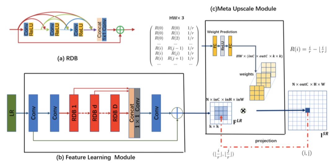 本文选用 RDN 作为特征学习模块,如图 1(b)所示。这里,本文聚焦于 Meta-Upscale 的公式化建模。