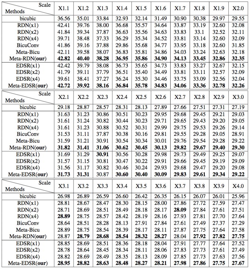 同时,Meta-RDN 也由于Meta-Bicu, 这是因为对于在特征图插值,缩放因子越大,有效的 FOV 越小,性能下降越多。但是,在 Meta-SR 中,每个缩放因子具有相同的 FOV。受益于 Meta-Upscale,相较于其他 baselines,Meta-RDN 几乎在所有缩放因子上取得了更优性能。