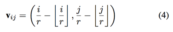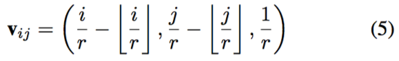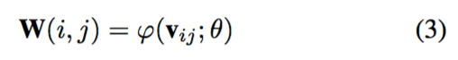 其中 v_ij 是与 i, j 相关联的向量,也是权重预测网络的输入,其可表示为:
