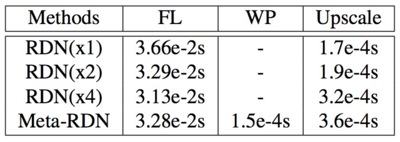 在表 2 中,FL 表示 Feature Learning 模块,WP 表示 Meta-SR 的 Weight Prediction 模块,Upscale 是 Upscale 模块。测试是跑在 B100 上,测试的缩放因子是 2。