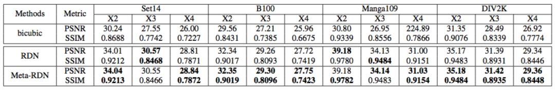 表 3:当缩放因子为X2, X3, X4,Meta-RDN与 RDN 的对比结果