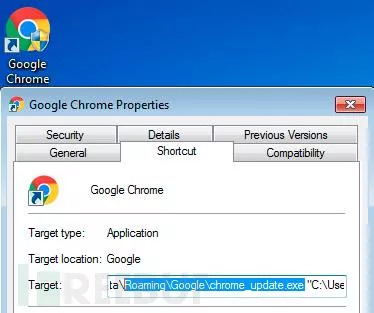6.创建一个新的指向已下载Payload的链接并替换目标链接:.TargetPath =%AppData%\Google\chrome_update.exe。