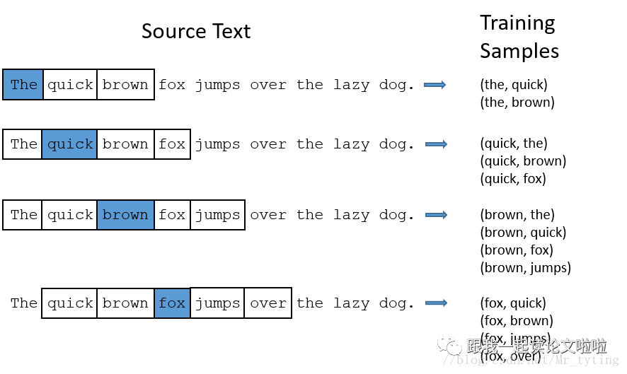 上述代码就是切句子,然后切词,得出的一个个训练样本 ,其中 就是模型输入, 就是该词周边的某个单词。