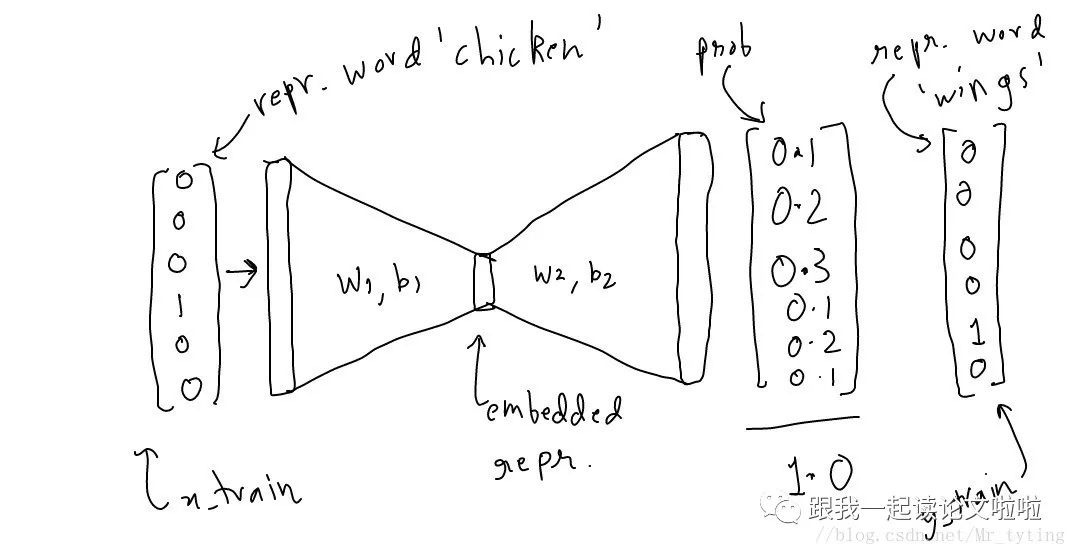负采样:采用一种所谓的"负采样"的操作,这种操作每次可以让一个样本只更新权重矩阵中一小部分,减小训练过程中的计算压力。举例来说:一个 如: ,由上面的分析可知,其 为一个 向量,并且该向量只是在 的位置为 1,其余的位置均为 0,并且该向量的长度为 ,由此每个样本都缓慢能更新权重矩阵,而"负采样"操作只是随机选择其余的部分 ,使得其在 的位置为 0,那么我们只更新对应位置的权重。例如我们如果选择负采样数量为5,则选取5个其余的 ,使其对应的 为 0,这个时候 只是6个神经元,本来我们一次需要更新 参数,进行负采样操作以后只需要更新 个参数。