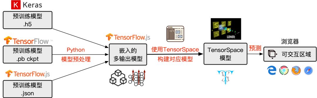 首先你需要有一个使用常用框架训练好的预训练模型,常见的模型都是只有输入输出两个暴露给用户的接口。TensorSpace 可以全面地展示层间数据,不过需要用户将模型转换成多输出的模型,过程详见以下文档。