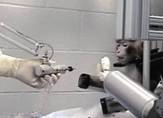 提取神经信号建立植入式脑机接口系统。Nicolelis 领导的研究小组采集了夜猴运动皮层神经电信号,对神经信号进行解码对远程机器臂进行实时控制( 开环控制),成功实现了“Monkey Think Robot Do”的神奇演示[6]。此后,Nicolelis 小组又成功开发了闭环机器臂控制脑机接口系统。同时,美国Pittsburgh 大学 Schwartz 实验室研究人员将微电极植入运动受限的猴子运动神经皮层,获取运动相关的神经电活动,并训练猴子利用思维活动控制机器臂( 图2) [7]。