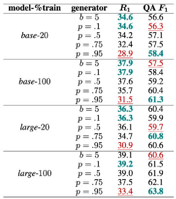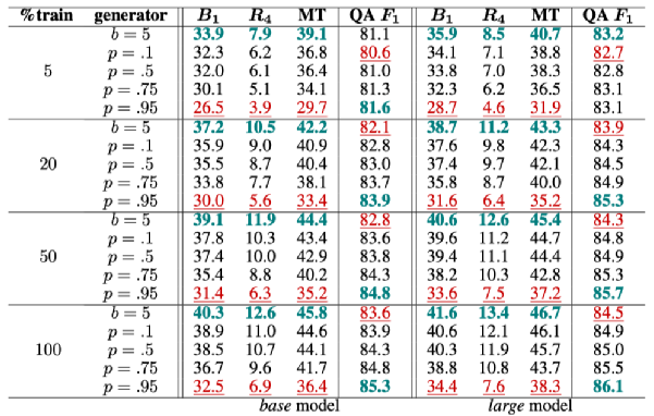 如上图,绿色代表每个指标中最优结果,红色代表最差结果。可以看出:尽管beam search在不同数据量的训练中,所有QG metrics都高于NS@p的方式,但是在QA的表现上,只有在数据量为5%时高于NS@p。上述实验对于每个答案只生成一个问题,作者还增加了一个实验,在RoBERTa-large,数据量100%,p=0.95,每个答案生成5个问题时,QA F1=86.4。
