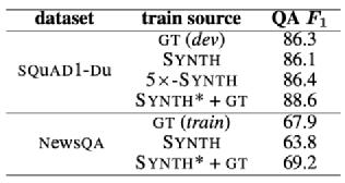 可以看出,在SQuAD上,GT的效果86.3略高于SYNTH(合成问题)86.1,但是当使用该模型对每个答案生成5个问题时,其QA F1达到了86.4,高于GT。将合成结果和GT合并后,其效果1+1>2。在NewsQA也出现类似的结论。