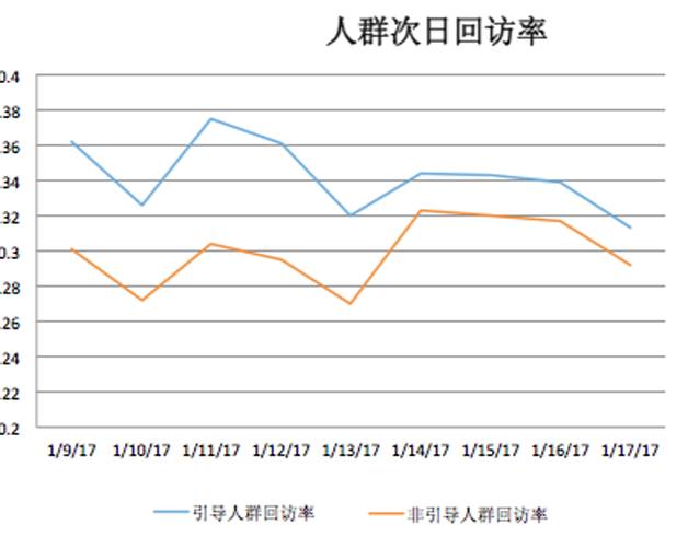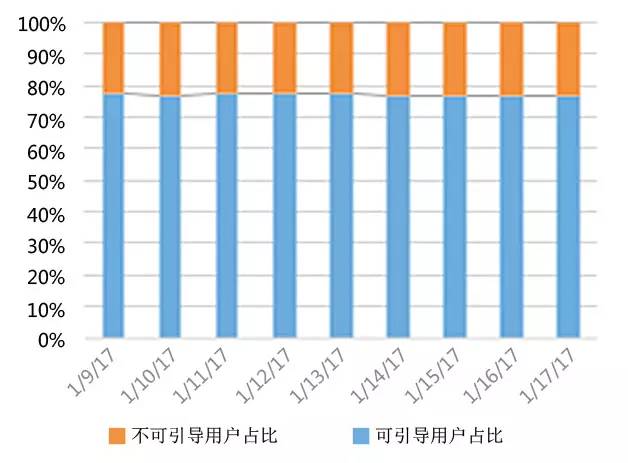 从效果看,引导和非引导次日回访率随时间逐步接近,流失率也在随时间递减,说明随时间的推移,人群的分群会逐渐稳定。从全局占比看,大部分用户都是可以引导的。