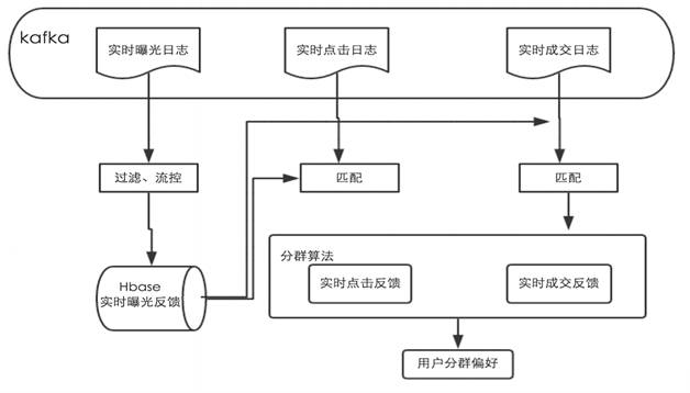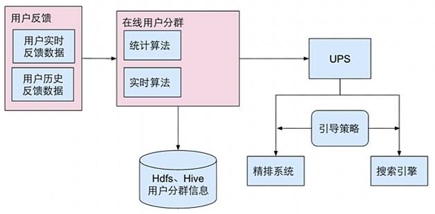 将用户的反馈分为实时和离线两种,在Spark Stream上搭建在线分群模块,最后将用户群的数据存储在UPS中,在精排增加引导策略,实现对用户在线实时分群引导,其数据流如图3。
