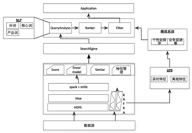 我们的个性化方案不是直接把特征放入模型,而是将排序分为初排和精排,在精排层做个性化。这样精排可以只对topN个商品做个性化,qps有明显提升。因此在架构上,如图1,在传统的搜索引擎上层加了一个精排,设计UPS系统做为用户实时、离线特征存储模型。