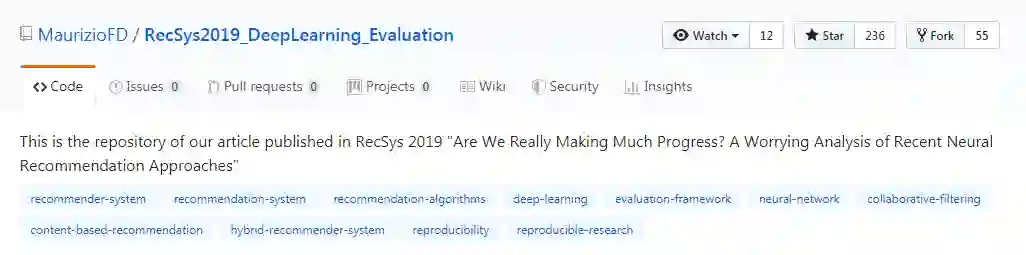 这篇论文也非常有意思,针对当前top-n推荐任务中已有前沿方法的复现性进行了一系列实验分析。考虑了过去几年在顶级研究会议上提出的18种算法(KDD、SIGIR、WWW和RecSys)。但只有7中算法能够合理地复现,并且其中6种方法没有最简单的启发式方法(例如,基于最近邻居或基于图的技术)好。另一方面,作者也发现,一些论文通常通过将一个复杂的神经模型与另一个神经模型进行比较来说明其方法的优越性但这是不够的,因为该神经模型不一定是最好的Baseline。作者也open了其代码,在文末我们也把这18篇论文列出来了。这篇工作揭示了当前机器学习科研学术中存在的一些潜在问题,值得各位科研工作者深思。