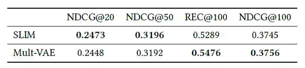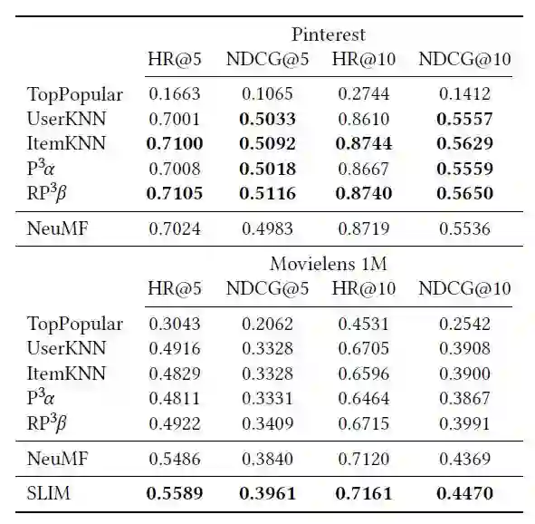 表6显示,尽管NeuMF优于baseline,但SLIM方法(一个比较简单的线性方法[33])比baseline好,在这个数据集上也优于NeuMF。