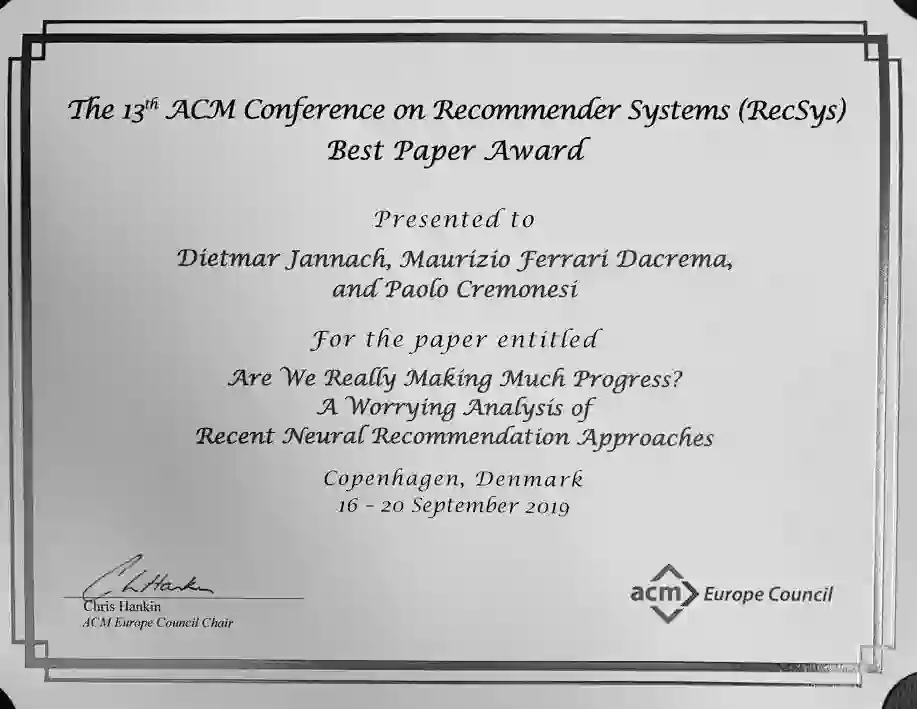 【导读】第 13 届推荐系统顶级会议 ACM RecSys 正在 9 月 16 日到 20 日的丹麦哥本哈根举行。来自米兰理工大学的Maurizio Ferrari Dacrema等人的论文《Are We Really Making Much Progress? A Worrying Analysis of Recent Neural Recommendation Approaches》获得了最佳长文。