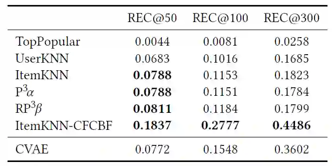 一般来说,在列表长度为50时,ItemKNN-CFCBF在所有测试的配置中始终优于CVAE。