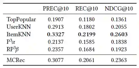 表3显示,传统的ItemKNN方法在正确调参时,在所有性能指标上都优于MCRec。