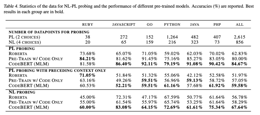 这部分研究代码到文档的生成问题,并在六种编程语言中研究了生成任务在Code Search Net Corpus上的结果。另外,为了证明CodeBERT在代码到NL生成任务中的有效性,作者采用了各种预训练的模型作为编码器,并保持了超参数的一致性。 实验结果如下:在编程语言上进行预训练的模型的性能优于ROBERTa