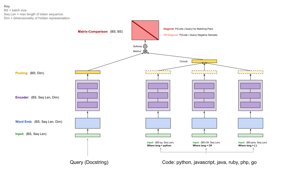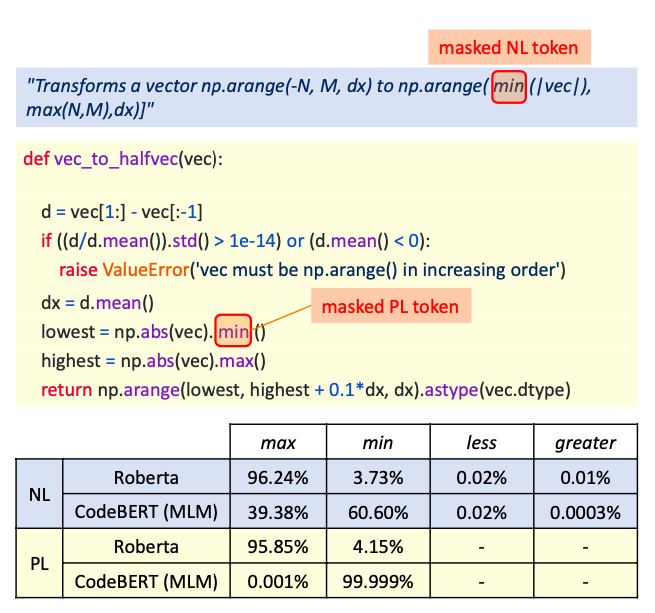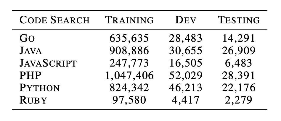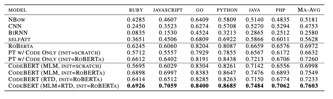 论文链接:https://arxiv.org/pdf/2002.08155.pdf 这篇论文提出了一个被称为「CodeBERT」的双模预训练模型,据作者介绍,这也是目前已知的第一个大型 NL-PL(自然语言-编程语言)预训练模型。该预训练模型能够处理NL-PL 的普遍问题,例如用自然语言搜索代码、自动生成代码等。所谓自然语言代码搜索,所要解决的问题是,如何通过自然语言query查找到所需的代码块,这和我们常用的搜索引擎(通过自然语言query来查找所需网页)类似。事实上,微软Bing在2018年便上线了类似的功能,在搜索框中输入自然语言 “convert case using a function of R”,便会返回一段 R 代码。针对自然语言代码搜索,在这篇论文里,作者在 CodeSearchNet语料库上对CodeBERT进行了预训练并做微调,这是一个包含了 6 种较为普遍的代码语言(分别为Ruby、JavaScript、Go、Python、Java、PHP)的语料库。如下图所示,他们在自然语言代码搜索任务中取得了SOTA的结果: