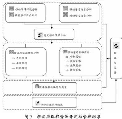 而要实现资源共享,必须首先要设计一份具备广泛兼容性的“移动微课程资源开发与管理标准”,针对移动微课程的开发标准框架、开发规范、结构化定义等细节内容加以整体规划和具体说明,从而最大程度支持标准化微课程内容资源建设以及离线学习用户体验,如图7所示。