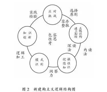 新建构主义思想主要有三个方面内容:第一,提出了知识的三级结构假设,认为知识可分为一级结构(感性认识)、二级结构(理性认识)和三级结构(联想),三者构成了一个类似于榕树的结构。第二,在借鉴经典建构主义思想的基础上,结合互联网时代的特点,提出新建构主义七要素:情境、搜索、选择、写作、交流、创新、意义建构。第三,给出新建构主义理论逻辑结构图,如图2所示[14]。