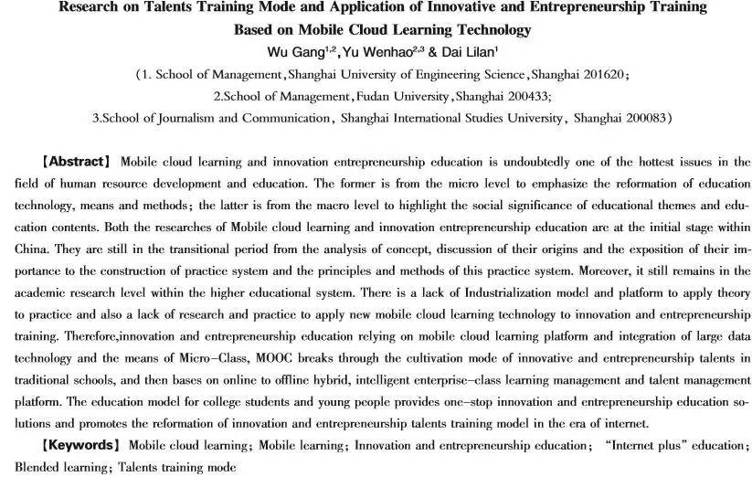 关键词:移动云学习;移动学习;创新创业教育;“互联网+”教育;混合学习;人才培养模式