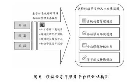平台既充分支持IS010015、GB/T19025国家标准以及SCORM、AICC等国际标准规范,同时又有效改善用户/企业用户对于创新创业教育人才培养流程和内容资源匮乏的现状。平台能够兼容移动互联网主流操作系统和终端设备,提供经过内容认证的体系化课程资源库,帮助用户一站式实现人才培养方案的导入和全程辅导。并且,对于用户在人才培养体系建立过程中如何科学规划目标、导入管理标准、建立流程关联等核心问题上,给出了较为完备的解决方法。其能够有效帮助用户科学构建学习蓝图,快速创建移动云学习模式下的个性化人才培养与评估环境,实现实时知识更新,低成本使用优质云端的学习及培训资源和服务,如图8所示。