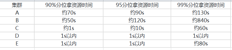 下边为主要几个集群SU拿资源的时间分布 (fuxi基本调度单元), 可以发现这几个集群90%分位拿资源的时间基本都在1分钟左右(符合线上基线作业等待资源达到90s进行抢占配置预期)。