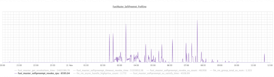 从下面几张图中可以看到,在基线时间段(00:00 ~ 09:00), 基线作业超时拿不到资源发起交互式抢占revoke的频率明显高于其他时段, 这意味着通过交互式抢占加速的手段基线作业可以顺利拿到所需资源。双十一期间的线上运行情况,也证明了 在资源压力大的情况下,高优先级基线作业明显通过了交互式抢占revoke获得了资源。